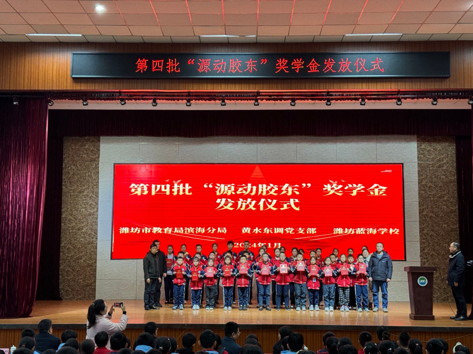 1月17日下午,黃水東調(diào)黨支部聯(lián)合濰坊藍(lán)海學(xué)校在藍(lán)海學(xué)校行政樓報(bào)告廳舉行了第四批“源動(dòng)膠東”獎(jiǎng)學(xué)金頒發(fā)儀式,對(duì)藍(lán)海學(xué)校2023學(xué)年榮獲獎(jiǎng)學(xué)金的42名優(yōu)秀學(xué)生進(jìn)行表彰。濱海區(qū)教育分局黨組成員、副局長(zhǎng)袁玉松,山東水發(fā)黃水東調(diào)工程有限公司黨支部書(shū)記、董事長(zhǎng)申勇,總經(jīng)理宋致軍,濰坊藍(lán)海學(xué)校黨支部書(shū)記、校長(zhǎng)楊偉平等出席,共計(jì)300余名師生參加此次活動(dòng)。