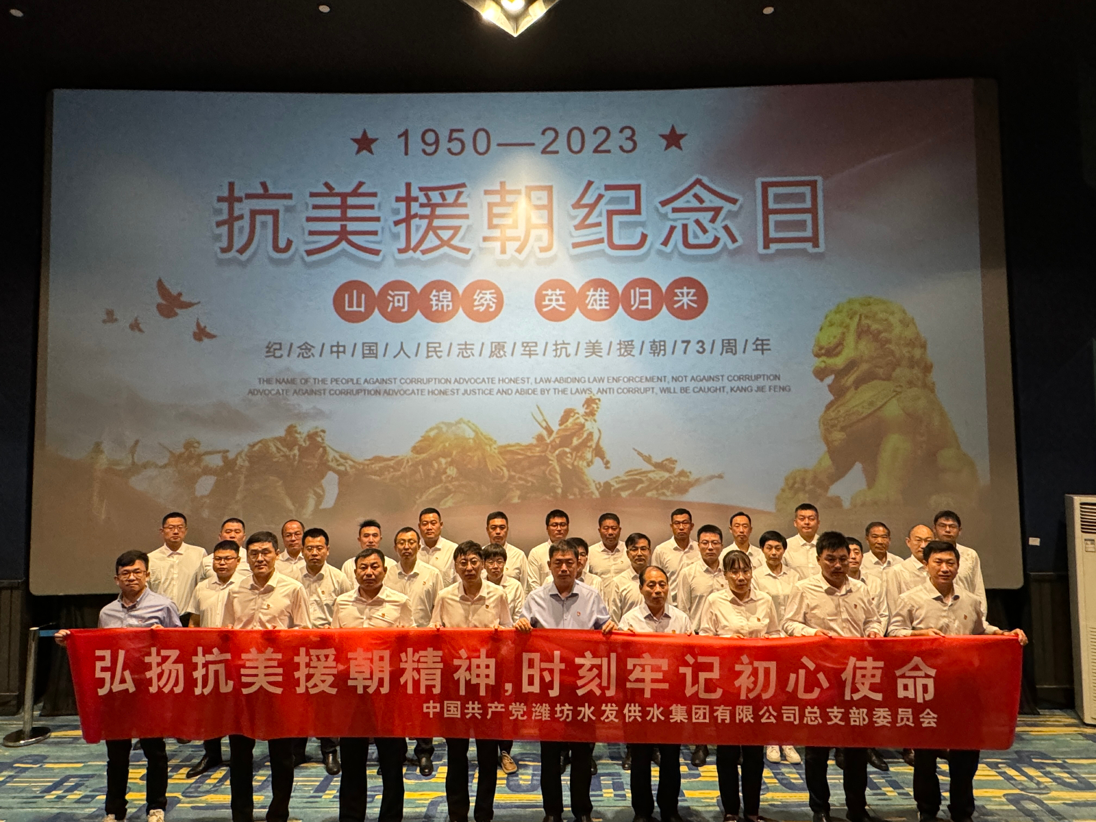 10月25日是抗美援朝73周年紀(jì)念日,為教育引導(dǎo)廣大黨員干部弘揚(yáng)英模精神,重溫先烈英雄事跡,弘揚(yáng)偉大抗美援朝精神。供水集團(tuán)黨總支組織開展“弘揚(yáng)抗美援朝精神 時(shí)刻牢記初心使命”主題黨日活動(dòng)。通過(guò)重溫入黨誓詞、觀看愛(ài)國(guó)主義電影等方式,引導(dǎo)廣大黨員干部弘揚(yáng)傳承家國(guó)情懷,把愛(ài)國(guó)奮斗內(nèi)化于心,外化于行。